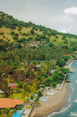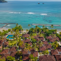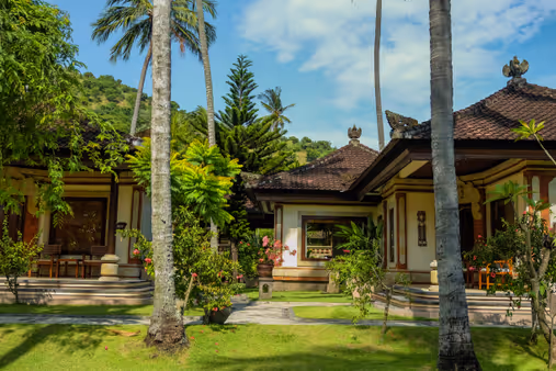 48 traditionally furnished rooms (approx. 48 sqm) with a touch of Balinese architecture, spread across several cottages. Nestled between lush gardens and the ocean, they offer full comfort and privacy. Equipped with a double bed, an open bathroom (approx. 20 sqm) with shower and bathtub, hairdryer, minibar, slippers, bathrobe, safe, coffee & tea set, kettle, air conditioning, TV, telephone, Wi-Fi, and a terrace with seating. If you require a twin room, please specify this when booking.