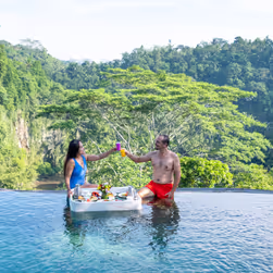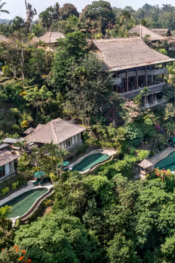 62 luxurious villas with bath, shower/WC, hairdryer, air conditioning, coffee/tea set, minibar, safe, telephone, satellite TV, DVD and CD player, Wi-Fi, refrigerator. 34 Deluxe Pool and 13 Royal Pool villas feature a separate living area, private garden, heated pool (approx. 30 sqm) and terrace with a unique view of the Ayung River. 3 Royal Spa villas boast a private outdoor whirlpool and pavilion for spa treatments, ample privacy, and breathtaking views of the valley. SGL are DB for single use.