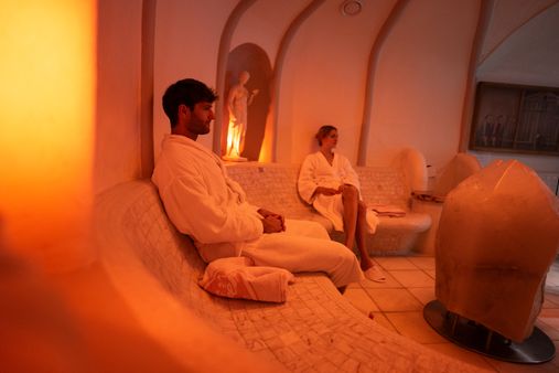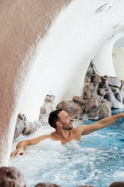 In the spacious indoor thermal pool (16 x 12 m, 32°C), you can relax wonderfully or swim laps actively. In the diverse sauna area, Finnish sauna, pine and herbal sauna, rock crystal tepidarium, and an aroma steam bath provide intense warmth experiences. A real highlight is the romantically designed thermal grotto with waterfall, whirlpool, and underwater massage, ideal for diving deep and letting go.